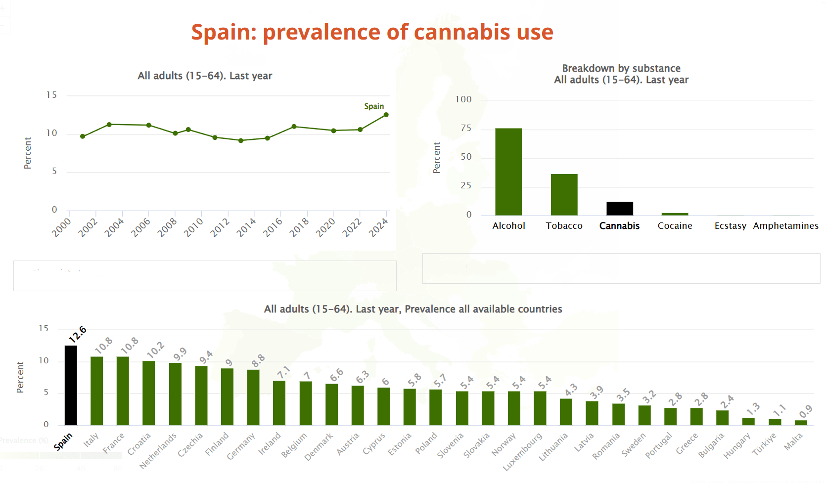 Detrás de España se sitúan Italia y Francia, con un empate técnico de un 10,8 %, en segundo y tercer lugar, completando así el pódium de medallistas. En el último puesto del ranking se sitúa Malta con solamente un 0,9%; un país donde curiosamente el consumo de cannabis es completamente legal, sirva este dato como aviso a navegantes y voceros apocalípticos en contra de la legalización.