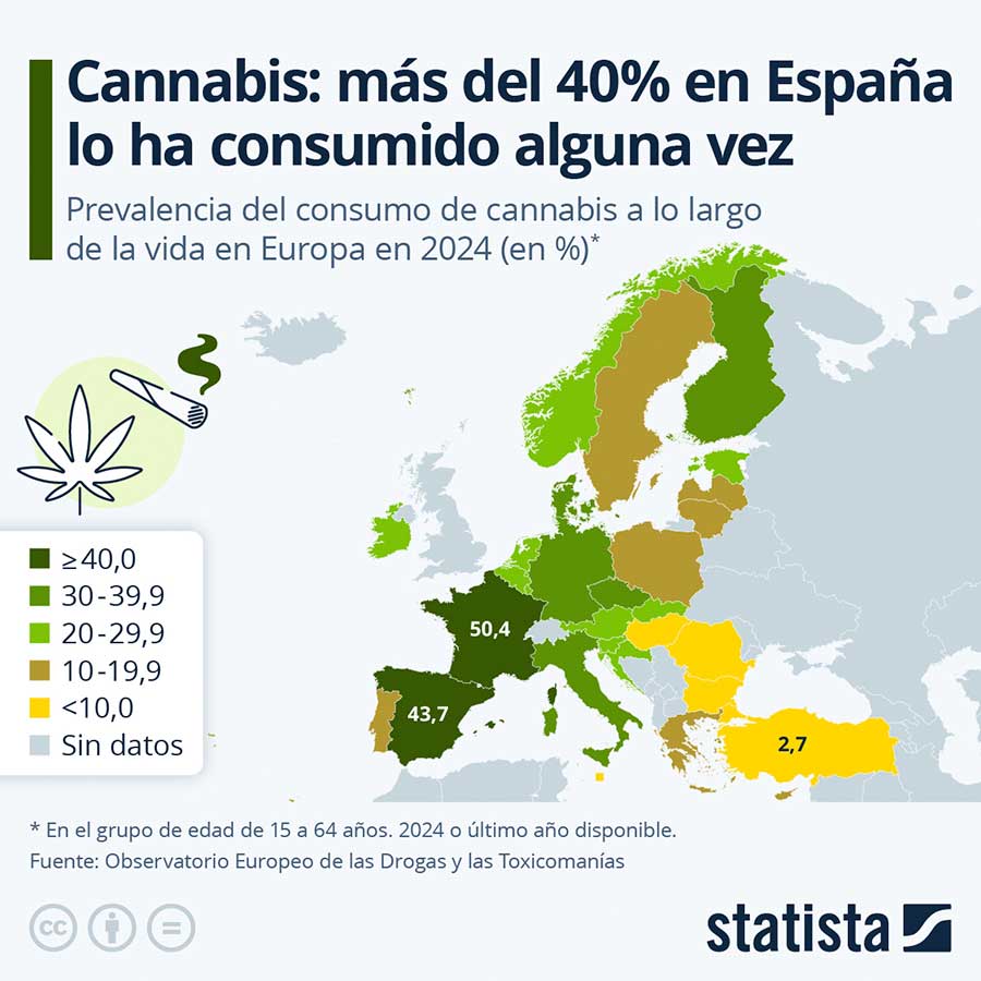 No obstante, la EUDA no es el único organismo que emite estudios y estadísticas sobre el consumo del cannabis en Europa, así el Observatorio Europeo de las Drogas y las Toxicomanías (EMCDDA) en su último análisis del año 2024, llega a la conclusión de que más del 40% de la población de España ha consumido cannabis en alguna ocasión.
