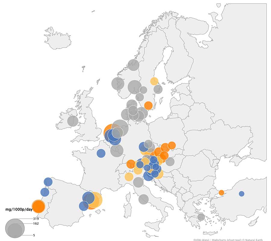 The table below presents the 2024 values for the cannabis metabolite, distinguishing between weekday and weekend averages, for the 80 European cities for which validated data are available.