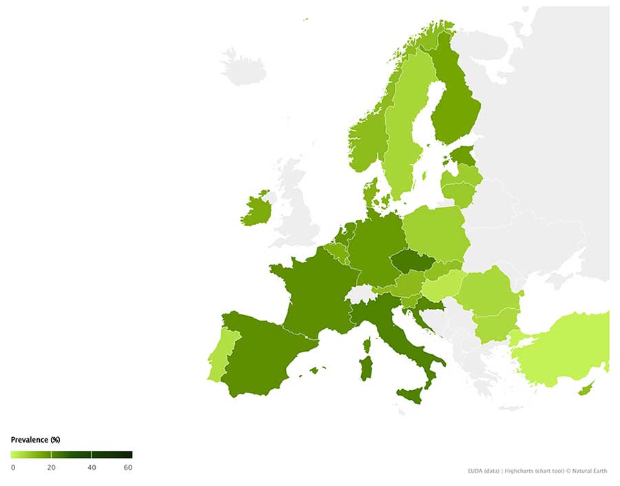 The consumption data presented in the following chart are based on general population surveys submitted to the European Drugs Agency (EUDA) by national focal points and are drawn from studies conducted between 2013 and 2023.