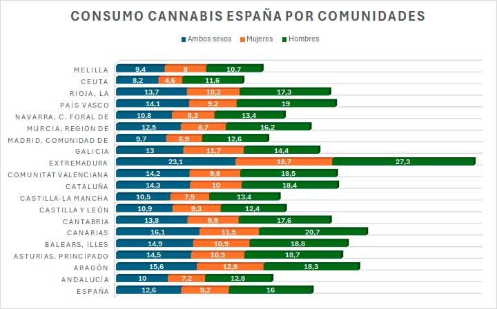 Como podemos observar, el nuevo estudio muestra incrementos de la prevalencia de consumo en prácticamente todas las Comunidades Autónomas, destacando sobre todo el fuerte incremento (18,5% más) experimentado en Extremadura que con un 23,1% pasa a ocupar el primer puesto del ranking de forma muy destacada.